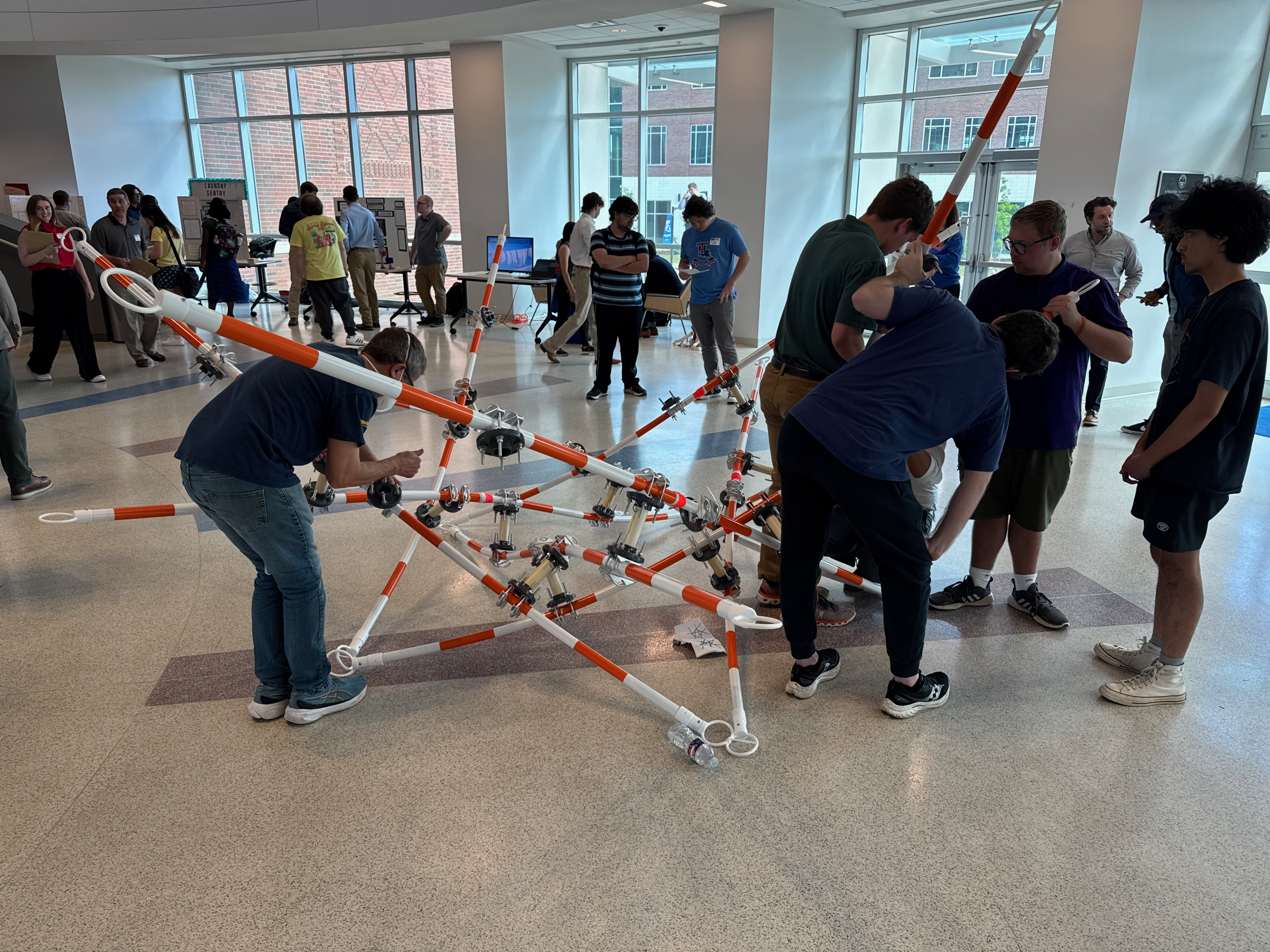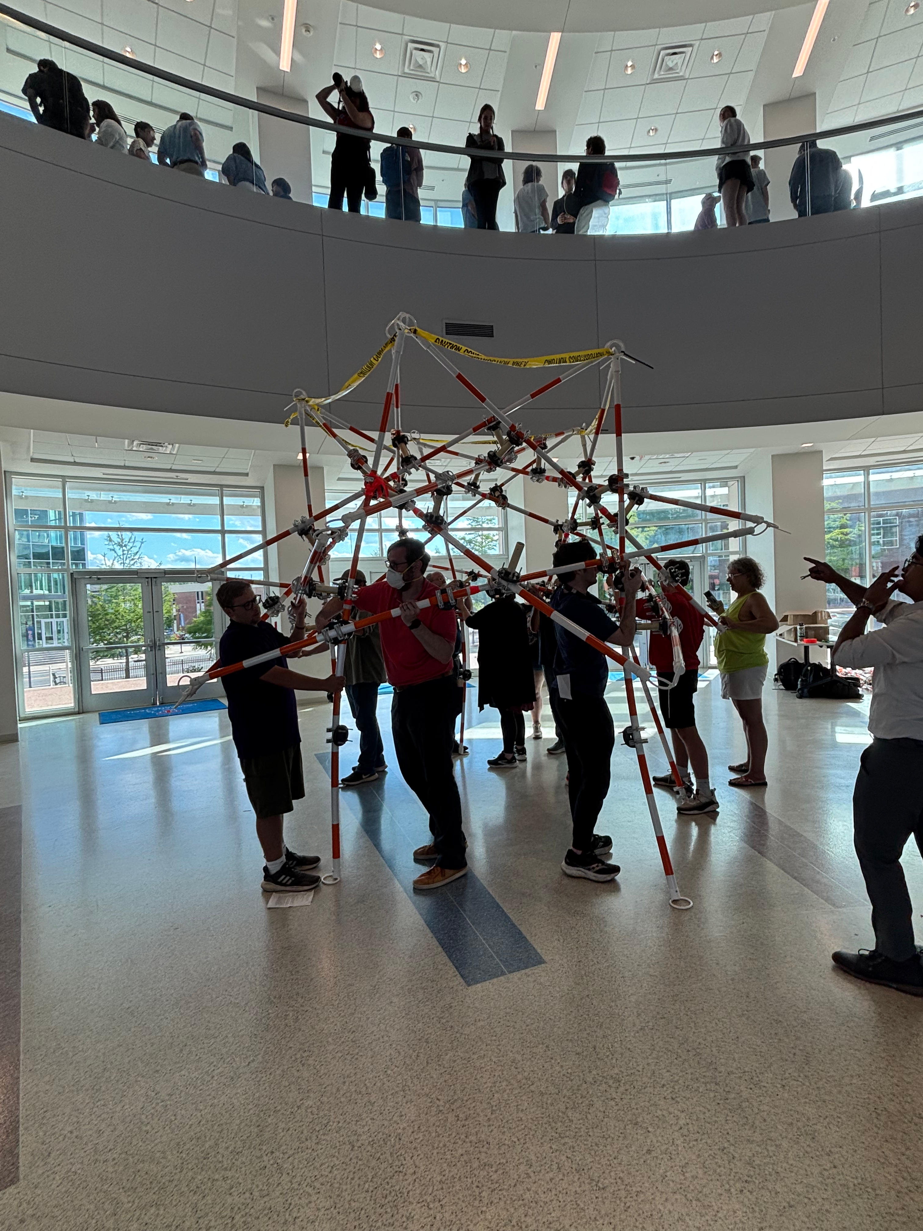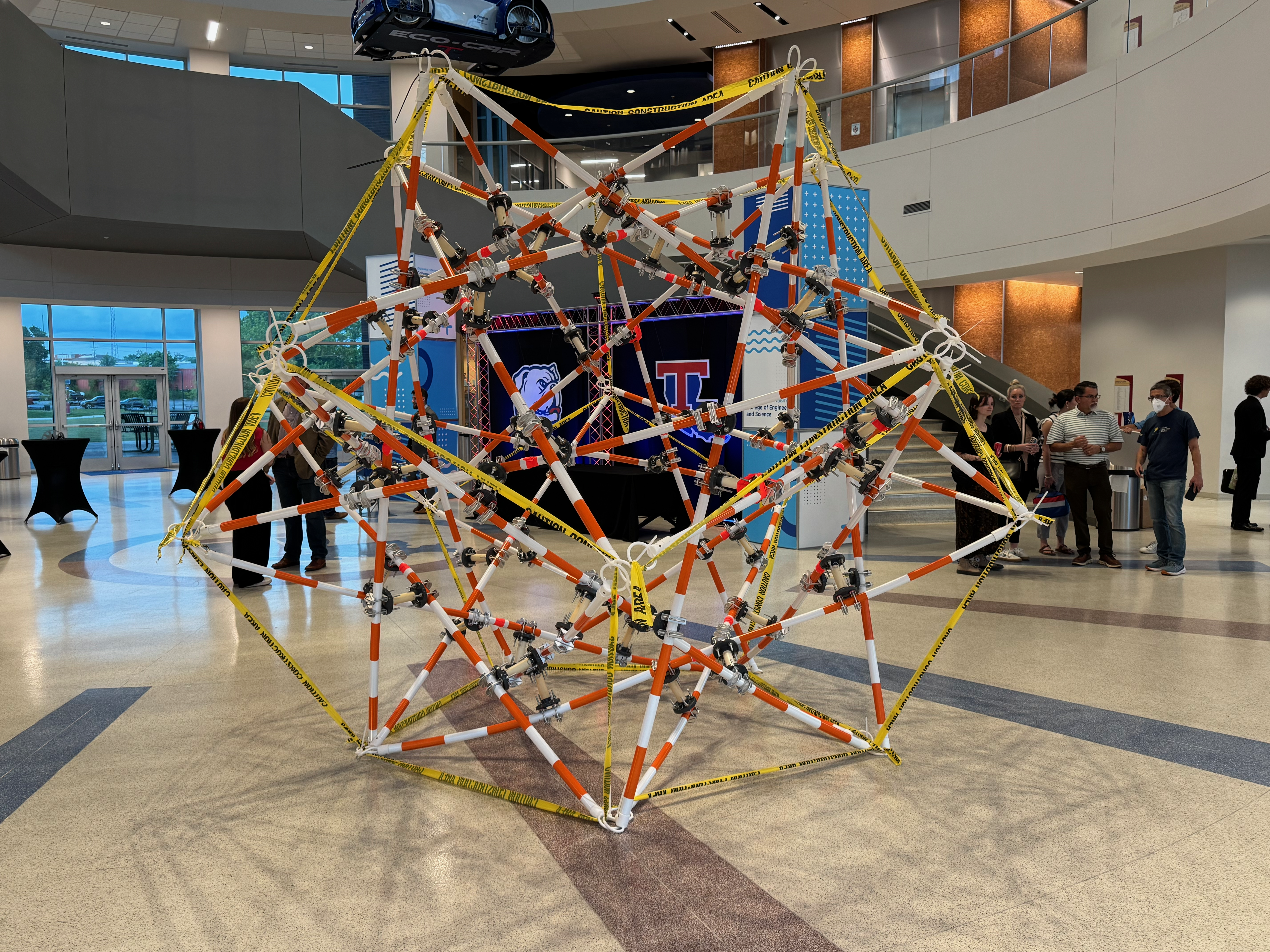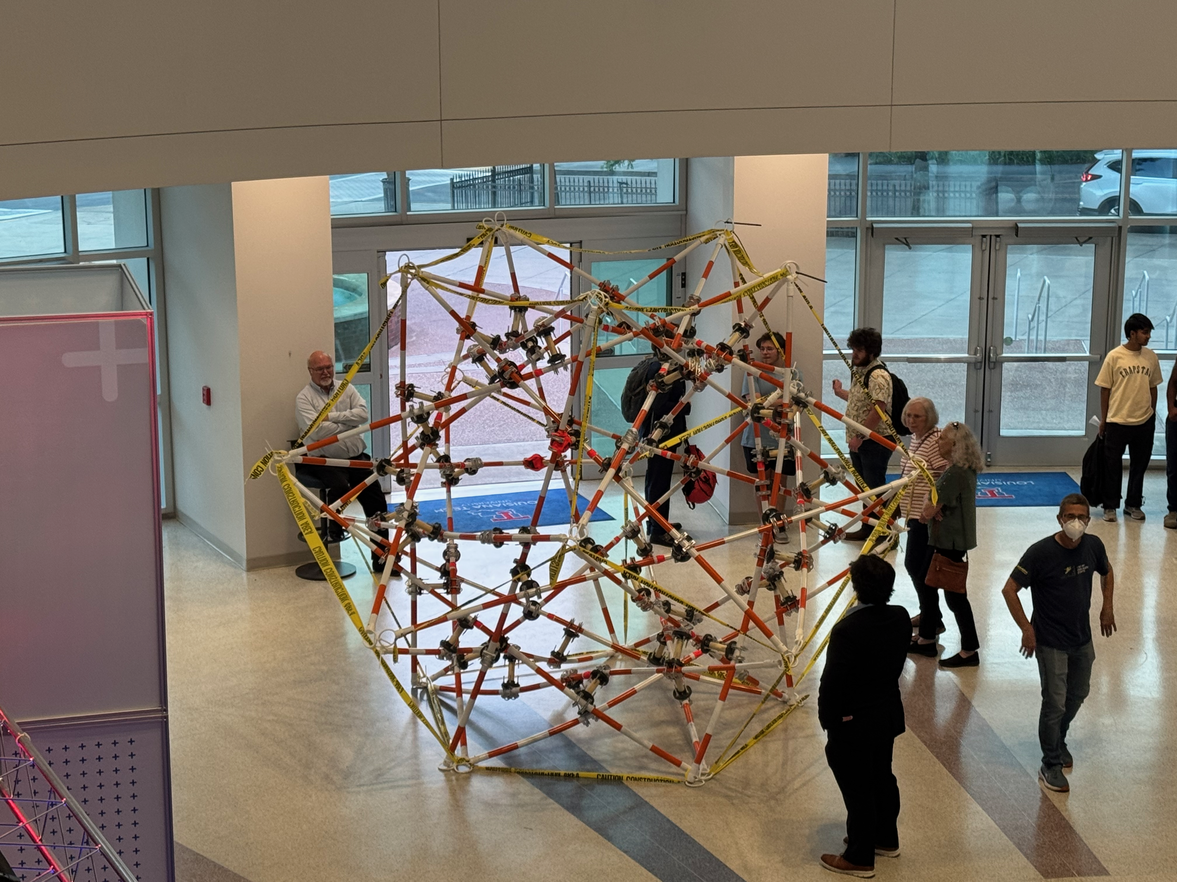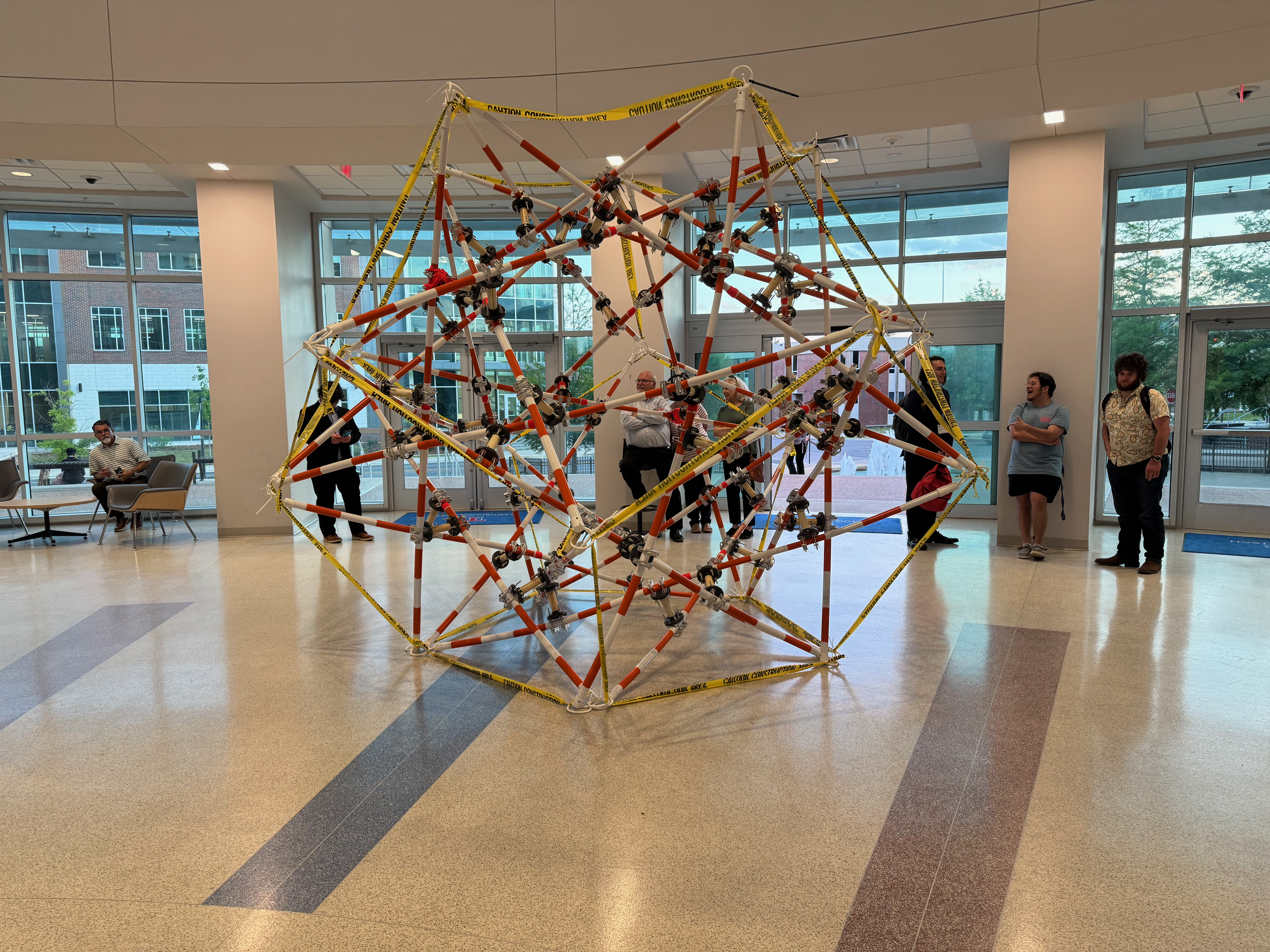 The piece is a compound of five tetrahedra, showcasing the symmetry and structural richness of one of the Platonic solids. Built collaboratively on Thursday and disassembled Friday morning, this temporary installation brought together students, faculty, and visitors in a hands-on exploration of three-dimensional geometry at architectural scale.